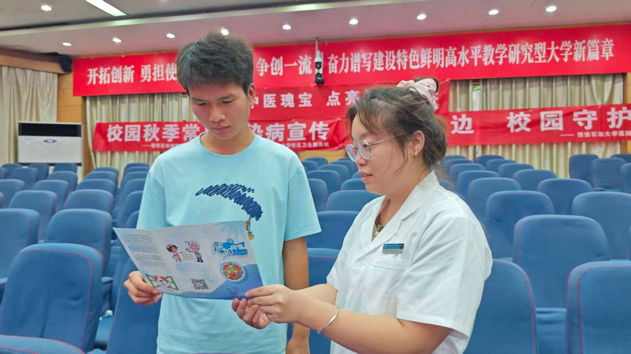 秋季是各類傳染病的高發(fā)期與傳染高峰期,為增強廣大新生的傳染病防控意識,防止各類傳染病在校內(nèi)蔓延,雁塔區(qū)疾病預防控制中心副主任醫(yī)師李海軍帶來了結(jié)核病防治的相關(guān)知識和措施講解。他系統(tǒng)梳理了結(jié)核病的早期癥狀識別方法、規(guī)范治療流程以及校園防控重點舉措,內(nèi)容豐富且實用,讓新生們對傳染病的防治有了更深入的了解。為了鞏固傳染病健康教育成果,校醫(yī)院醫(yī)務人員在健康科普的同時,向在場新生發(fā)放了傳染病防治健康知識宣傳手冊,并對同學進行耐心講解和指導,進一步強化了廣大學生對傳染病防治重要性的認識。