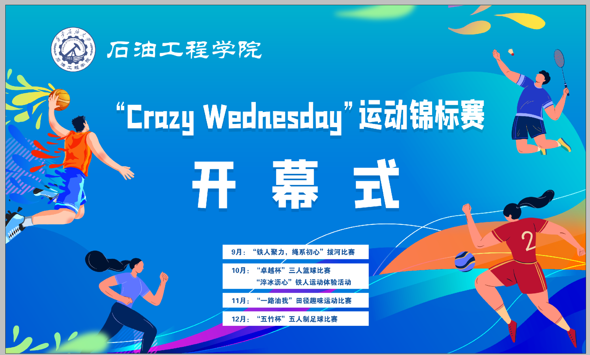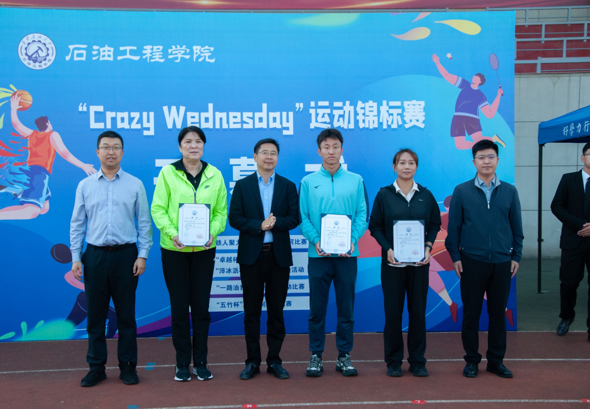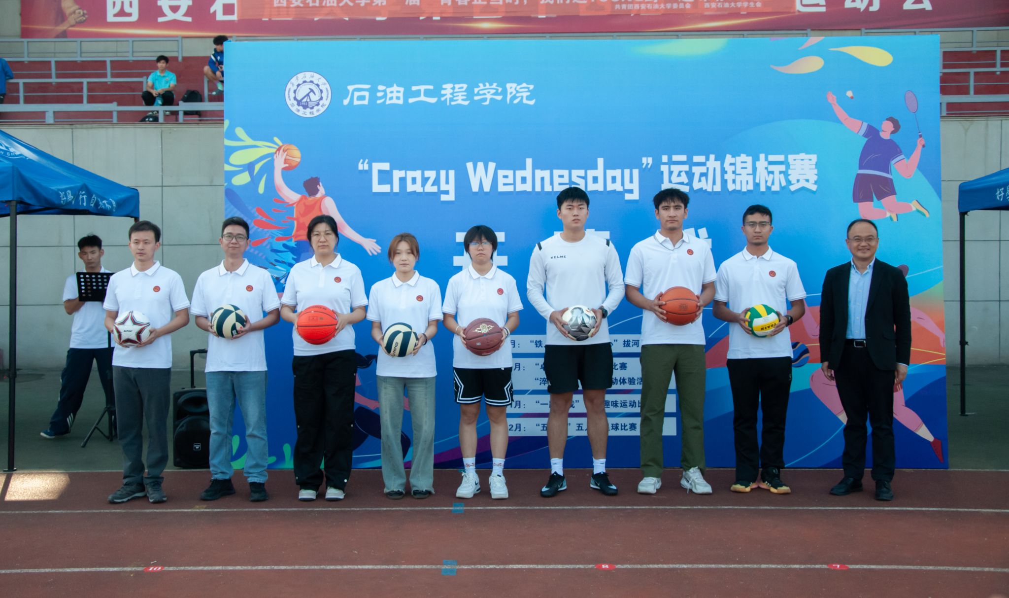 秋色浩無(wú)際,風(fēng)露洗晴空。924日,石油工程學(xué)院在鄠邑校區(qū)田徑場(chǎng)舉辦CRAZY WEDNESDAY瘋狂星期三運(yùn)動(dòng)錦標(biāo)賽開(kāi)幕式。副校長(zhǎng)趙健,黨委辦公室(校長(zhǎng)辦公室)、黨委學(xué)生工作部、石油工程學(xué)院、體育學(xué)院負(fù)責(zé)同志,受聘教練員、師生代表300余人參加開(kāi)幕式。