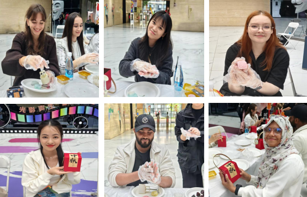 傳統(tǒng)民俗環(huán)節(jié),工作人員首先圍繞中秋節(jié)的歷史淵源、文化內(nèi)涵,以及不同地域特色的月餅種類進(jìn)行詳細(xì)講解,重點(diǎn)介紹了冰皮月餅的制作工藝。隨后,工作人員現(xiàn)場演示了冰皮月餅從制皮、包餡到壓模成型的完整過程,清晰的步驟講解與直觀的操作示范,讓留學(xué)生們躍躍欲試。在接下來的實(shí)踐環(huán)節(jié),留學(xué)生們兩兩一組、默契配合,親手揉制冰皮、包裹餡料、按壓模具,一個個造型精致、花紋清晰的冰皮月餅逐漸成型。活動現(xiàn)場歡聲笑語不斷,濃郁的中秋節(jié)日氛圍在動手實(shí)踐的樂趣中愈發(fā)濃厚。