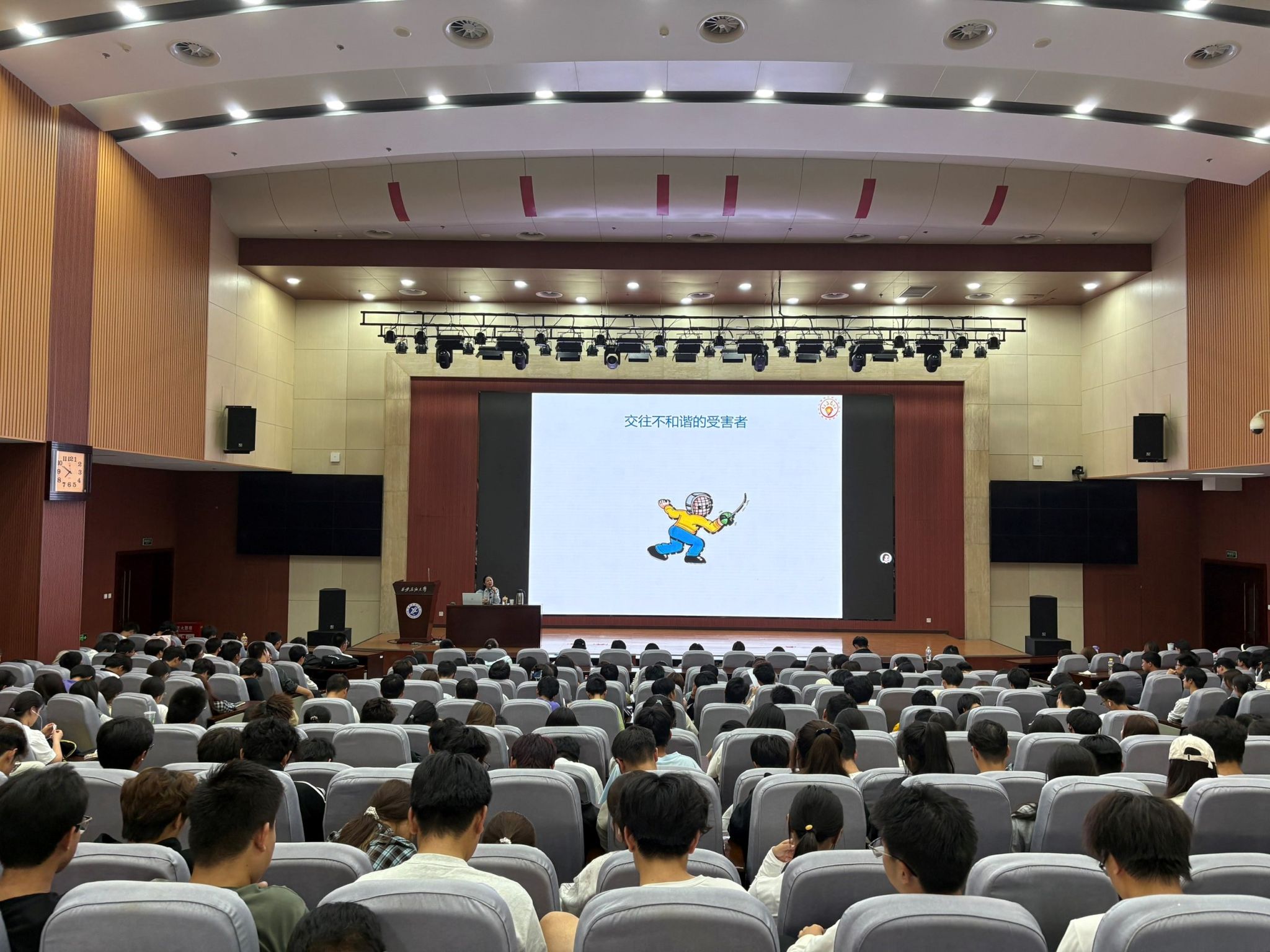 講座在輕松活潑的互動(dòng)中拉開(kāi)帷幕。肖老師以“拍拍肩、拉拉手、吼一吼”的破冰游戲打破陌生感,迅速點(diǎn)燃現(xiàn)場(chǎng)氣氛。同學(xué)們?cè)跉g聲笑語(yǔ)中拉近距離,報(bào)告廳內(nèi)暖意流動(dòng),為整場(chǎng)講座奠定了開(kāi)放而溫暖的基調(diào)。肖老師從大學(xué)生活的日常場(chǎng)景切入,圍繞“課堂占座”“圖書(shū)館互助”“觀點(diǎn)討論”等真實(shí)情境,生動(dòng)講述了同窗情誼對(duì)個(gè)人成長(zhǎng)的重要意義。她指出,大學(xué)不僅是知識(shí)的殿堂,更是人際交往能力提升的關(guān)鍵階段,良好的同伴關(guān)系是大學(xué)四年中最珍貴的“成長(zhǎng)禮物”。