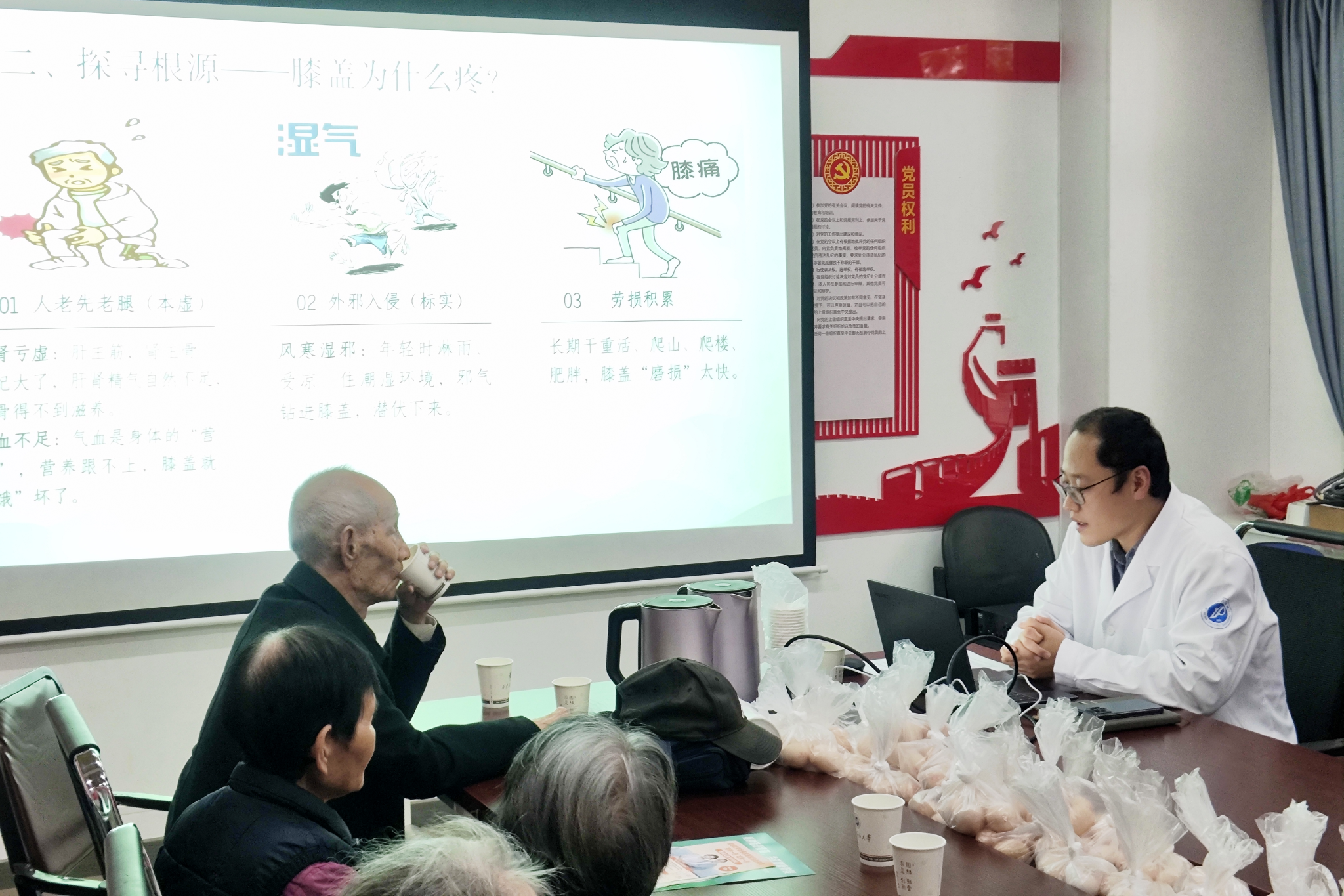 秋冬時節(jié)氣溫驟降,既是流感等傳染病的高發(fā)期,也是關節(jié)炎、高血壓等慢性病的易復發(fā)時段。針對這一健康痛點,校醫(yī)院精心設計講座內容,邀請兩位醫(yī)生從不同維度帶來實用指導:趙利劍醫(yī)生聚焦中老年人高發(fā)的關節(jié)炎,從中醫(yī)辨證施治角度切入,不僅糾正了日常生活中常見的關節(jié)養(yǎng)護錯誤姿勢,更提出“增加肌肉鍛煉,不增加關節(jié)負荷”的科學理念,通過演示正確鍛煉方法,手把手教大家如何保護雙膝關節(jié);洪艷萍醫(yī)生則圍繞秋冬季常見傳染病,詳細剖析高發(fā)原因與針對性預防措施,同時從飲食、作息、防護等方面引導大家養(yǎng)成良好生活方式,幫助老同志們科學防范傳染病侵襲。