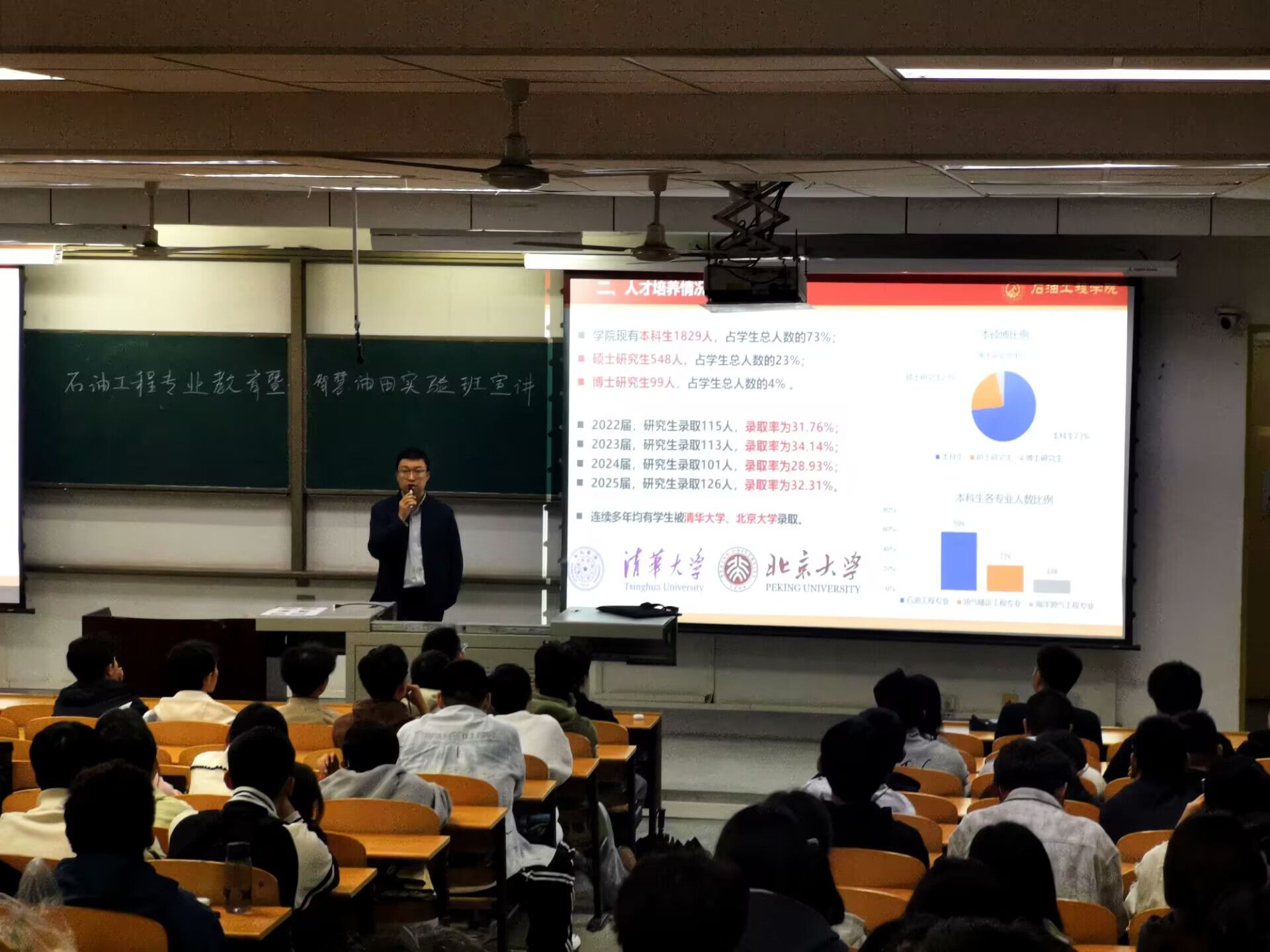 10月11日下午,王琛在博覽樓A139為石工卓越2501、2502班和石工2501—2506學(xué)生開展專業(yè)教育。他詳細(xì)介紹了學(xué)院整體情況,人才培養(yǎng)情況和教學(xué)改革創(chuàng)新方面的基本情況。重點圍繞學(xué)院近年來在教學(xué)改革方面的舉措,包括設(shè)立“智慧油田實驗班”,以“油氣工程+人工智能”為特色,通過小班化、前沿性教學(xué)模式,培養(yǎng)兼具工程實踐能力和創(chuàng)新思維的高層次人才。他鼓勵學(xué)生充分利用學(xué)院資源,積極參與學(xué)科競賽和科研項目,提升國際化視野與跨學(xué)科能力
