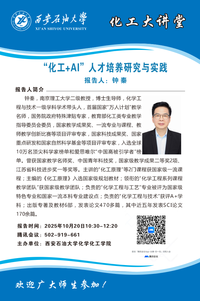 為深入探索人工智能時(shí)代化工專業(yè)與課程建設(shè)的新路徑與新方法,10月20上午化學(xué)化工學(xué)院化工大講堂”特邀南京理工大學(xué)二級(jí)教授、國家級(jí)教學(xué)名師鐘秦教授通過騰訊會(huì)議線上開展題為“化工+AI人才培養(yǎng)研究與實(shí)踐”的專題報(bào)告。報(bào)告會(huì)化學(xué)化工學(xué)院黨委書記孫會(huì)珠主持,化學(xué)化工學(xué)院學(xué)院師生代表近60人參加了報(bào)告會(huì)。