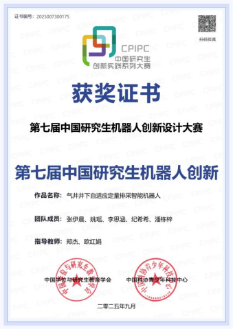 9月26日至29日,第七屆中國研究生機器人創(chuàng)新設(shè)計大賽全國總決賽在山東省濟南市融創(chuàng)國際會議中心隆重舉辦。本屆大賽報名啟動以來,全國224家培養(yǎng)單位的1545支隊伍參賽,較去年增加330余支。為保證大賽評審工作公平公正,大賽組委會邀請70家單位159位專家擔任初賽評委。8月27日大賽初賽評審?fù)瓿?,最終來自104家培養(yǎng)單位的325支隊伍入圍決賽。我校機械工程學(xué)院“氣井井下自適應(yīng)定量排采智能機器人”作品獲得全國三等獎,團隊成員有張伊晨、姚瑤、李思涵、紀希希、潘棟梓,鄭杰、歐紅娟任指導(dǎo)教師。