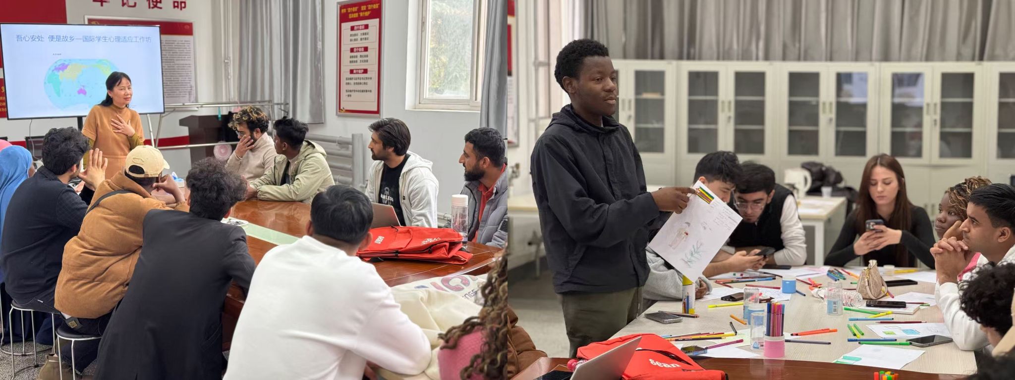 圍繞國際學生跨文化適應中的心理需求,第三期 “吾心安處,便是故鄉(xiāng)—國際學生心理工作坊”于11月14日在雁塔校區(qū)成功開辦,輔導員老師與16名國際學生共同參與。活動以中國傳統(tǒng)健身氣功八段錦開場熱身,幫助學生放松身心、快速融入氛圍;通過互動分享,引導參與者坦誠交流個人文化背景、在華學習生活經歷及遇到的適應難題,以“建立積極心態(tài)”“尋求社會支持”“實現自我成長”“共繪發(fā)展愿景”為主題進行敘事重構,通過教師專業(yè)引導與學生群體互動,幫助國際學生緩解文化沖擊帶來的心理壓力,切實提升跨文化心理適應能力,讓學生在校園中感受到家的溫暖。