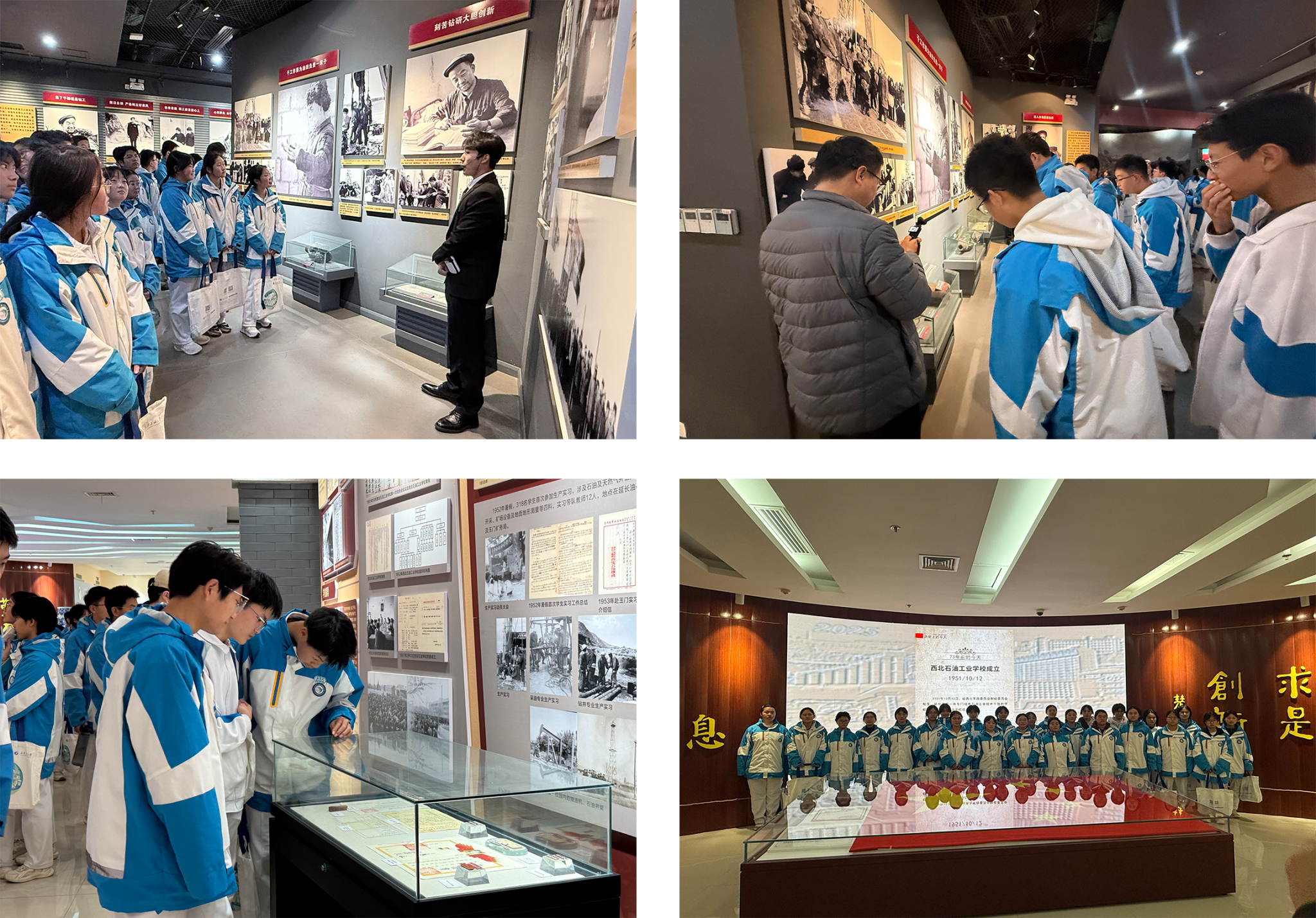 講座結束后,師生們在志愿者的引導下有序前往鐵人紀念館和校史館參觀。在參觀鐵人紀念館時,同學們被鐵人王進喜“寧可少活二十年也要拿下大油田”的英雄氣概所感染,為他身上所體現(xiàn)的“為國爭光、為民族爭氣”的愛國主義精神所震撼。通過珍貴的照片、陳列的實物以及講解員的講述,同學們深刻理解了鐵人的成長歷程和鐵人精神的內(nèi)涵。在參觀校史館時,同學們充分了解到我校創(chuàng)建的歷史使命和責任擔當,深刻體會到石油人的家國情懷和奉獻精神,真切感知到“愛國奉獻、艱苦奮斗、科學求實、開拓進取”的辦學精神,這種沉浸式的學習體驗,不僅加深了同學們對我校校園文化的理解,也進一步堅定了他們考入理想大學的信心與決心。