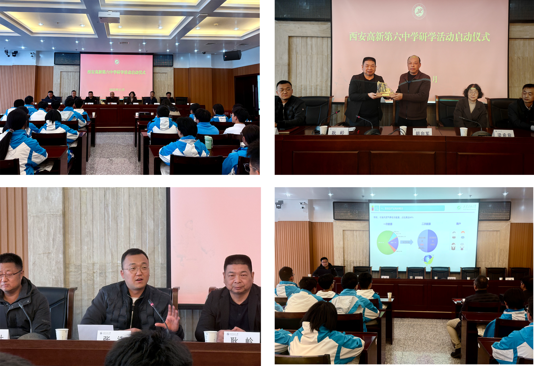 啟動儀式上,耿嶺代表學校對高新區(qū)第六高級中學師生代表的到來表示熱烈歡迎,并詳細介紹了學校的歷史沿革、專業(yè)特色和教學科研等方面的情況。他希望同學們通過近距離體驗大學生活,感知科研的嚴謹與魅力,體悟“為國找油,為民族爭氣”的崇高使命,將所見所聞內(nèi)化為學習的強勁動力,堅定目標,腳踏實地,努力成長為建設國家的棟梁之才。接著,耿嶺代表學校向中學贈送了抽油機模型,寄托了兩校友誼長存、共育英才的美好期望。隨后,張浩介紹了學校的招生政策和本次研學活動的具體安排。啟動儀式結束后,雒設計為高中同學們帶來了題為《馭光氫之“能”定國器之“材”》的科普講座,圍繞為什么發(fā)展氫能、氫能的內(nèi)涵、發(fā)展現(xiàn)狀以及廣闊前景四個方面,系統(tǒng)闡釋了氫能的前世今生與未來趨勢。
