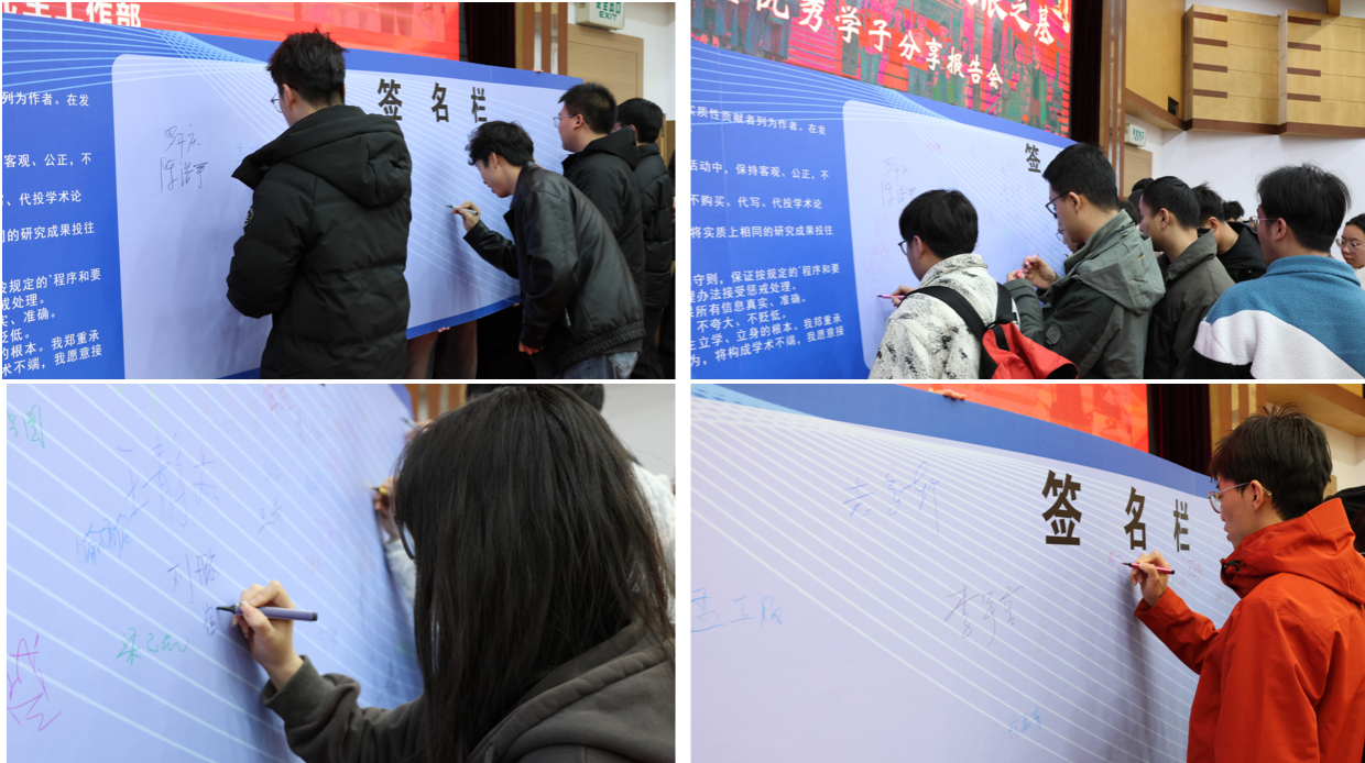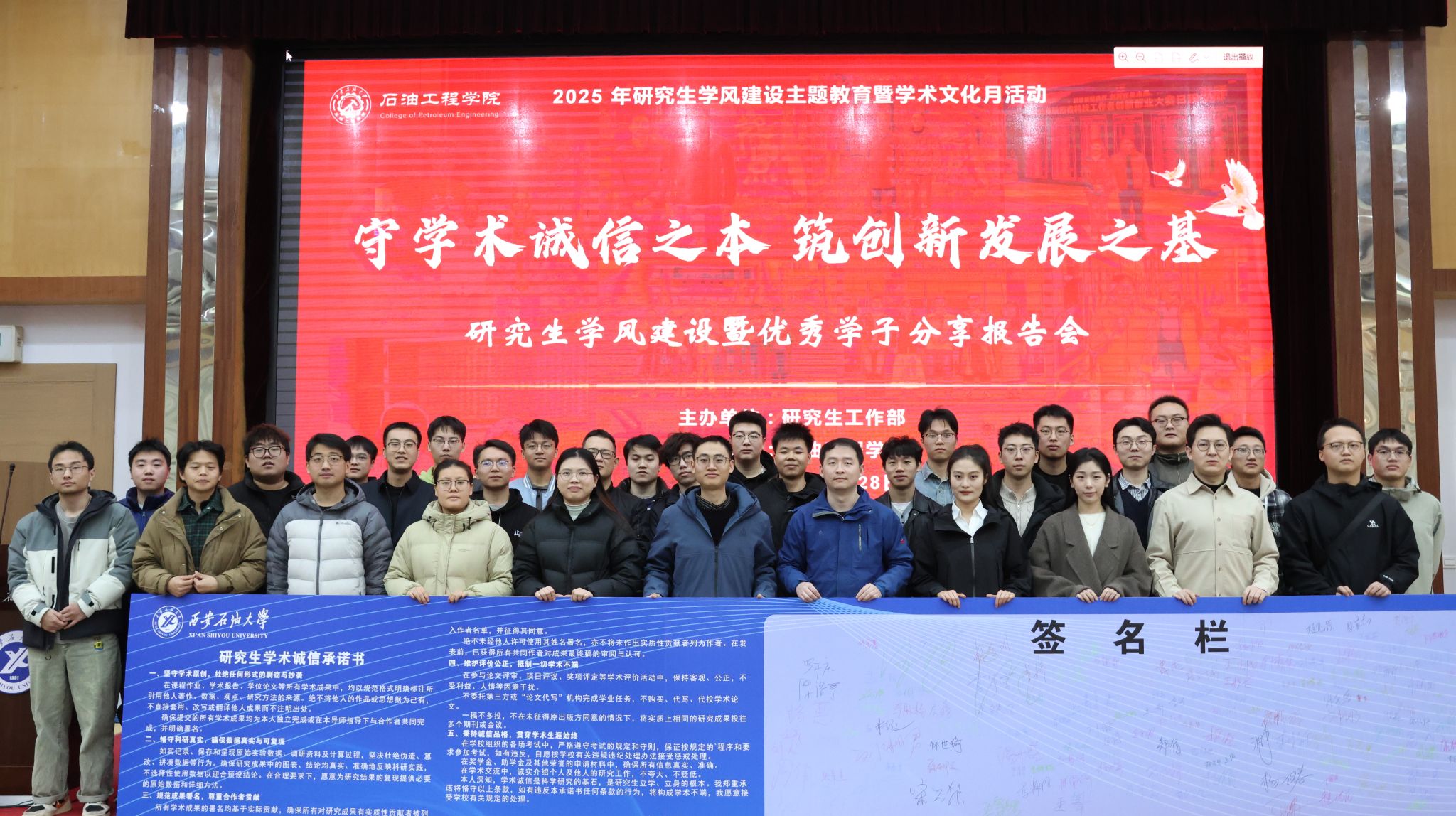 最后,石油工程學院研究生輔導員宋興淼在會上為全體研究生通報了近期全國高校中發(fā)生的學術(shù)不端案例,開展學術(shù)誠信警示教育,全體研究生依次簽署學術(shù)誠信承諾書并合影留念。