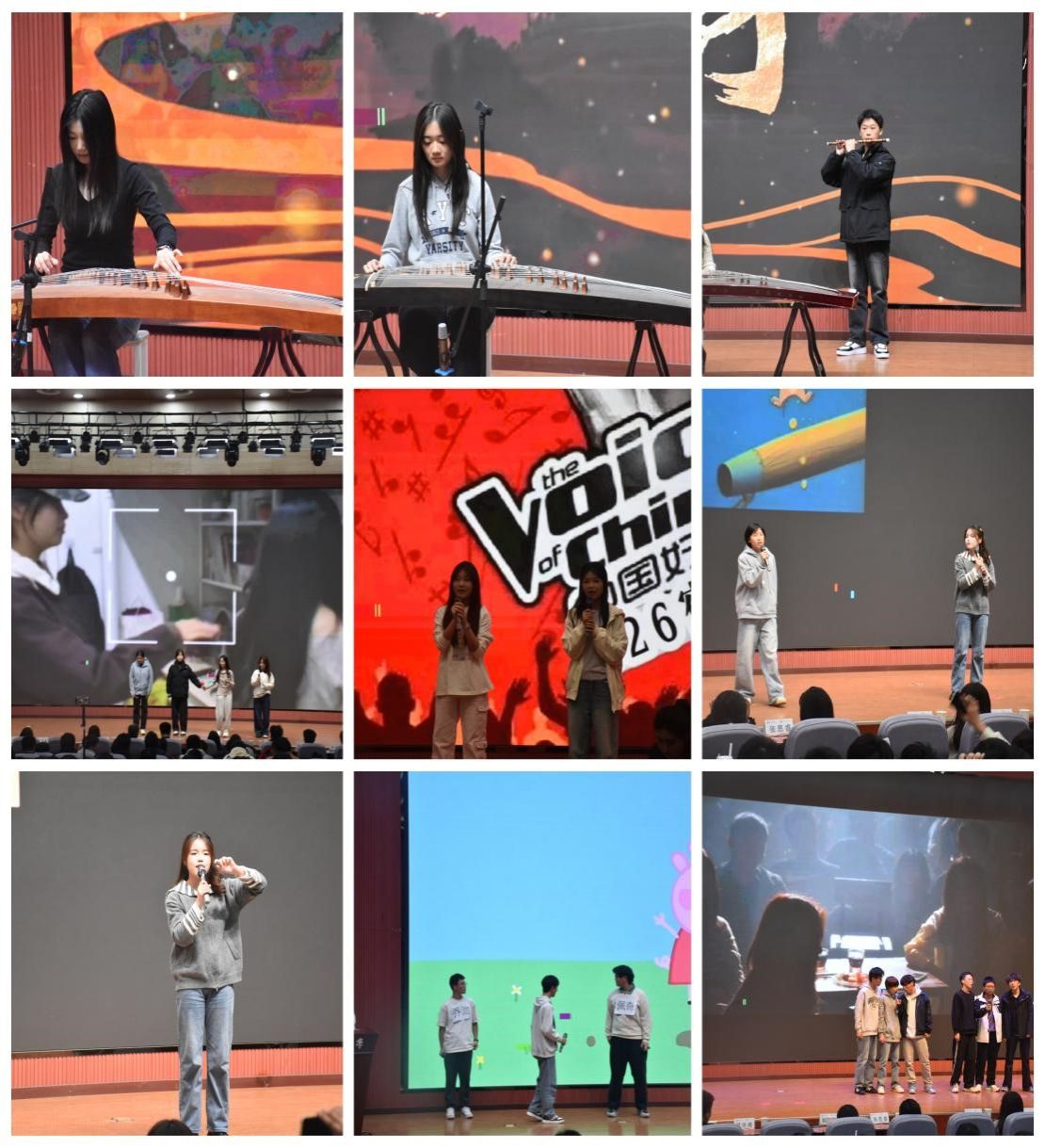 表彰環(huán)節(jié)結(jié)束后,獲獎(jiǎng)宿舍分別展示了各自的豐碩成果。民樂合奏《象王行》先聲奪人,氛圍瞬間點(diǎn)燃;五個(gè)宿舍依次登臺(tái)展示了各具特色的舍徽設(shè)計(jì)歷程,從理念構(gòu)思到視覺成型,每一處細(xì)節(jié)都凝聚著同學(xué)們的巧思與團(tuán)隊(duì)智慧;手抄報(bào)作品《雅室生輝》,通過圖文并茂的形式,生動(dòng)詮釋了宿舍文化的內(nèi)涵,彰顯出深厚的情感寄托與人文意趣;宿舍成員合唱《一笑傾城》、《愛錯(cuò)》、《成都》,以歌聲傳遞出室友間的溫情與默契;宿舍主題演講《屋檐下的星光》《致635的我們》,真摯表達(dá)了同學(xué)們對宿舍生活的深厚情感與美好期盼;舞臺(tái)劇《宿舍好聲音》、英語表演《Muddy Puddles》及微電影《629“甄嬛傳之曠課風(fēng)波》,則憑借生動(dòng)演繹與巧妙創(chuàng)意,將現(xiàn)場氣氛推向高潮,笑聲掌聲不絕。