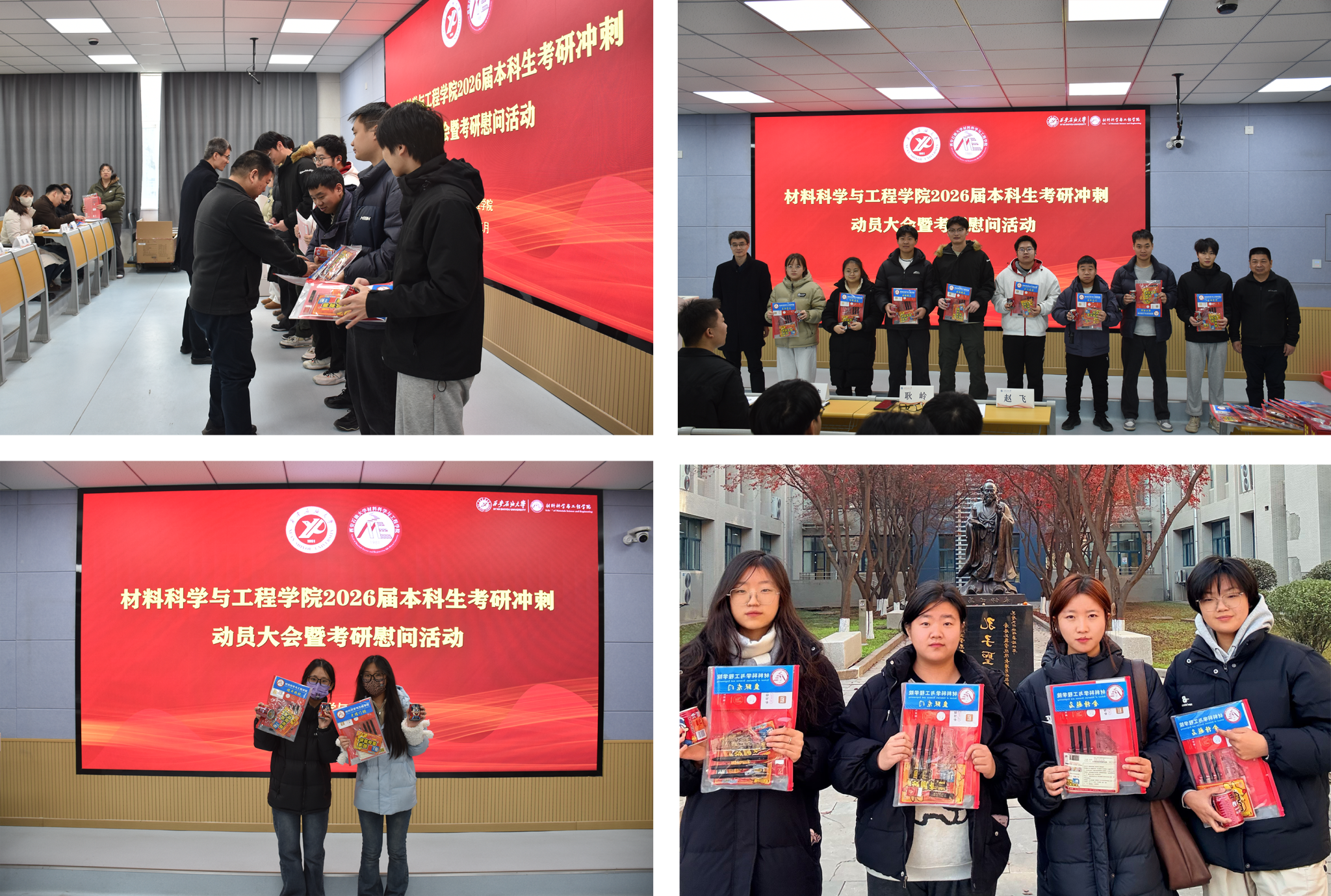 為深入貫徹“以生為本”育人理念,切實(shí)關(guān)懷考研學(xué)子備考狀態(tài),緩解備考?jí)毫?,增?qiáng)迎考信心,12月4日,材料科學(xué)與工程學(xué)院在鄠邑校區(qū)博覽樓110教室舉行2026屆本科生考研沖刺動(dòng)員大會(huì)暨考研慰問活動(dòng)。學(xué)院黨委書記耿嶺,黨委副書記屈敏佳,各年級(jí)輔導(dǎo)員和2026屆考研學(xué)生100余人參加活動(dòng)?;顒?dòng)由學(xué)院學(xué)生工作辦公室副主任趙飛主持。