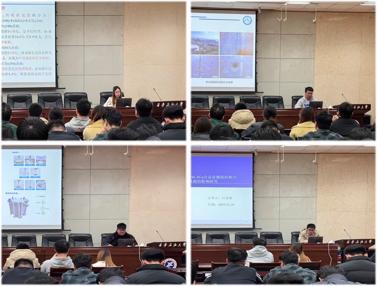 論壇中,四位主持創(chuàng)新基金項(xiàng)目的2023級碩士研究生,結(jié)合各自立項(xiàng)課題進(jìn)行了系統(tǒng)匯報(bào)與深度分享。安海娟從原子尺度揭示了氫在管線鋼表面的吸附機(jī)制;劉洢辰聚焦微生物腐蝕,探索基于生物競爭的綠色抑腐路徑;肖輝致力于開發(fā)高熵鈣鈦礦材料,以提升固體氧化物燃料電池的陰極性能;呂嘉鰲研究了陶瓷增強(qiáng)鋁硅銅合金的顯微組織調(diào)控與力學(xué)性能優(yōu)化。匯報(bào)內(nèi)容覆蓋能源材料、腐蝕防護(hù)以及復(fù)合材料等多個(gè)前沿方向,充分展現(xiàn)了我院研究生在創(chuàng)新基金支持下的科研實(shí)踐能力與創(chuàng)新思維。