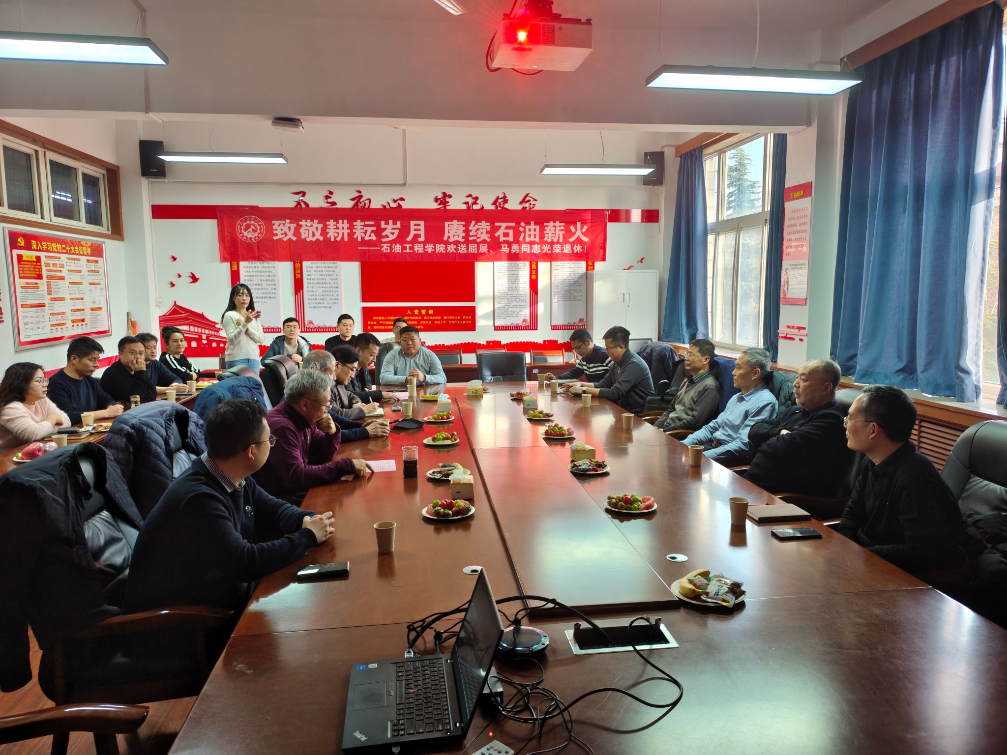 歲月如歌,薪火相傳。12月24日下午,石油工程學(xué)院雁塔校區(qū)第一教學(xué)樓603會(huì)議室隆重舉行“致敬耕耘歲月,賡續(xù)石油薪火”主題榮休會(huì),深情歡送屈展、馬勇兩位榮退教師。學(xué)院班子成員、退休教師代表、兩位老師往屆所帶學(xué)生和原任辦公室同事、學(xué)院教師代表齊聚一堂,共憶執(zhí)教歲月,共話師恩情誼,共送美好祝福。