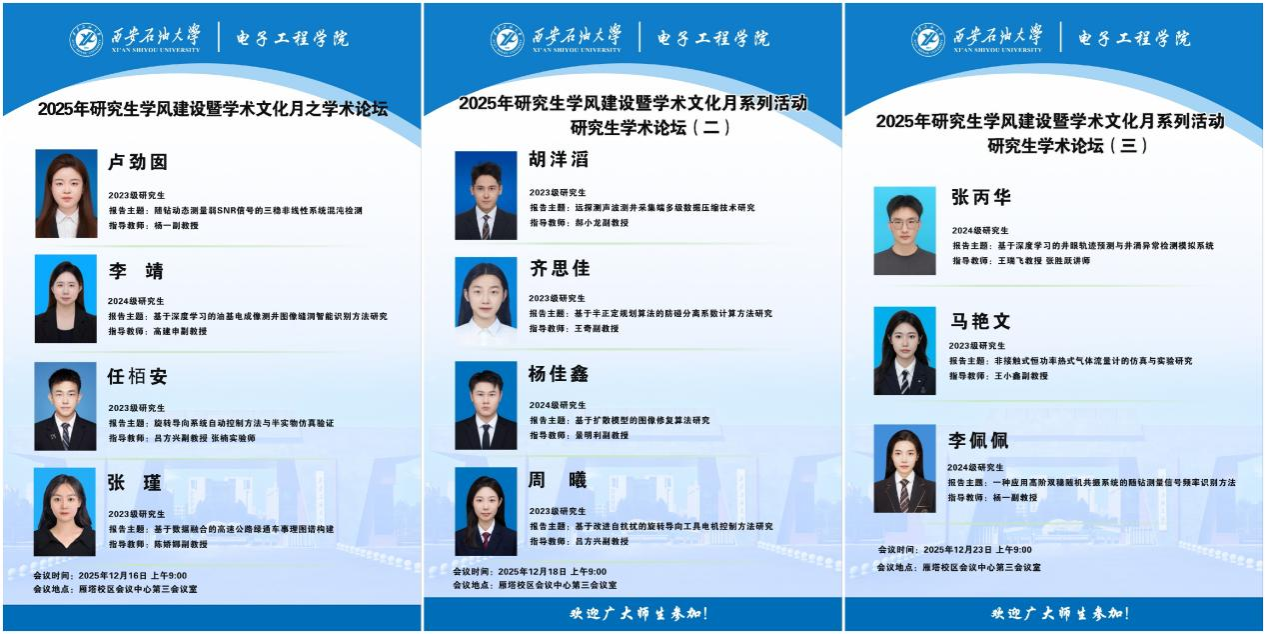 按照學(xué)校研究生工作部關(guān)于2025年研究生學(xué)風(fēng)建設(shè)暨學(xué)術(shù)文化活動(dòng)月的安排部署,12月16日至23日,電子工程學(xué)院2025年研究生學(xué)風(fēng)建設(shè)暨學(xué)術(shù)文化月之研究生學(xué)術(shù)論壇在雁塔校區(qū)會(huì)議中心第三會(huì)議室順利舉行。學(xué)院副院長(zhǎng)楊一、研究生輔導(dǎo)員李君、王曉天以及各年級(jí)研究生代表參會(huì),我院11位研究生代表作專題學(xué)術(shù)匯報(bào)。