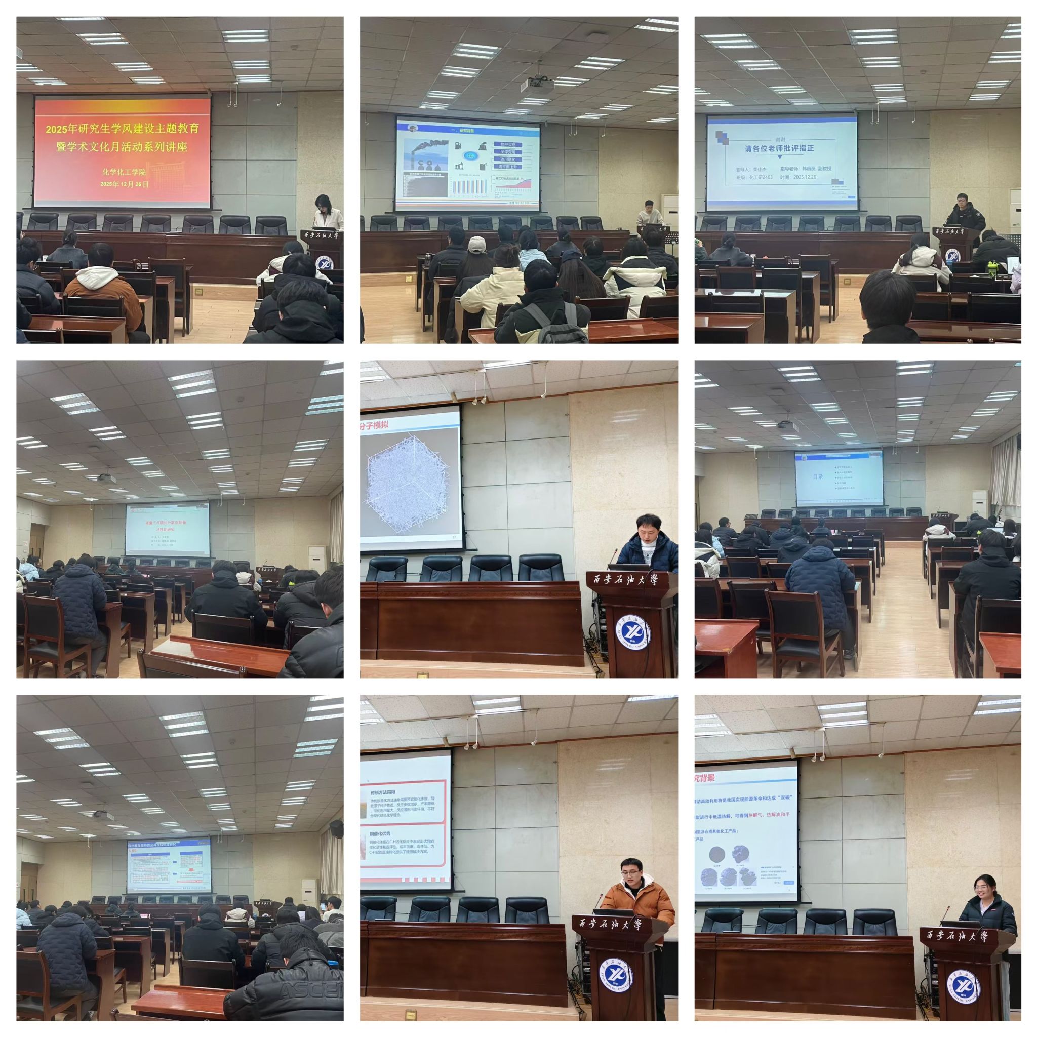 為持續(xù)深化研究生學(xué)風(fēng)建設(shè),搭建多領(lǐng)域?qū)W術(shù)交流平臺(tái),營(yíng)造開(kāi)拓創(chuàng)新、求真務(wù)實(shí)的學(xué)術(shù)氛圍,根據(jù)學(xué)校研究生工作部關(guān)于2025年研究生學(xué)風(fēng)建設(shè)暨學(xué)術(shù)文化活動(dòng)月的安排部署,12月26日下午,化學(xué)化工學(xué)院在雁塔校區(qū)會(huì)議中心第三會(huì)議室成功舉辦2025年研究生學(xué)術(shù)文化月第三場(chǎng)學(xué)術(shù)報(bào)告。本場(chǎng)活動(dòng)聚焦材料合成、催化反應(yīng)、能源利用、數(shù)值模擬等多個(gè)前沿學(xué)術(shù)方向,八位優(yōu)秀研究生依次登臺(tái)匯報(bào),充分展現(xiàn)了扎實(shí)的科研功底與鮮明的創(chuàng)新思維。學(xué)院專業(yè)教師李冰、張榕,綜合辦公室秘書(shū)馮旭亮,研究生輔導(dǎo)員曹勃及各年級(jí)研究生代表齊聚現(xiàn)場(chǎng),線上線下同步參與,共同沉浸于濃厚的學(xué)術(shù)交流氛圍中。