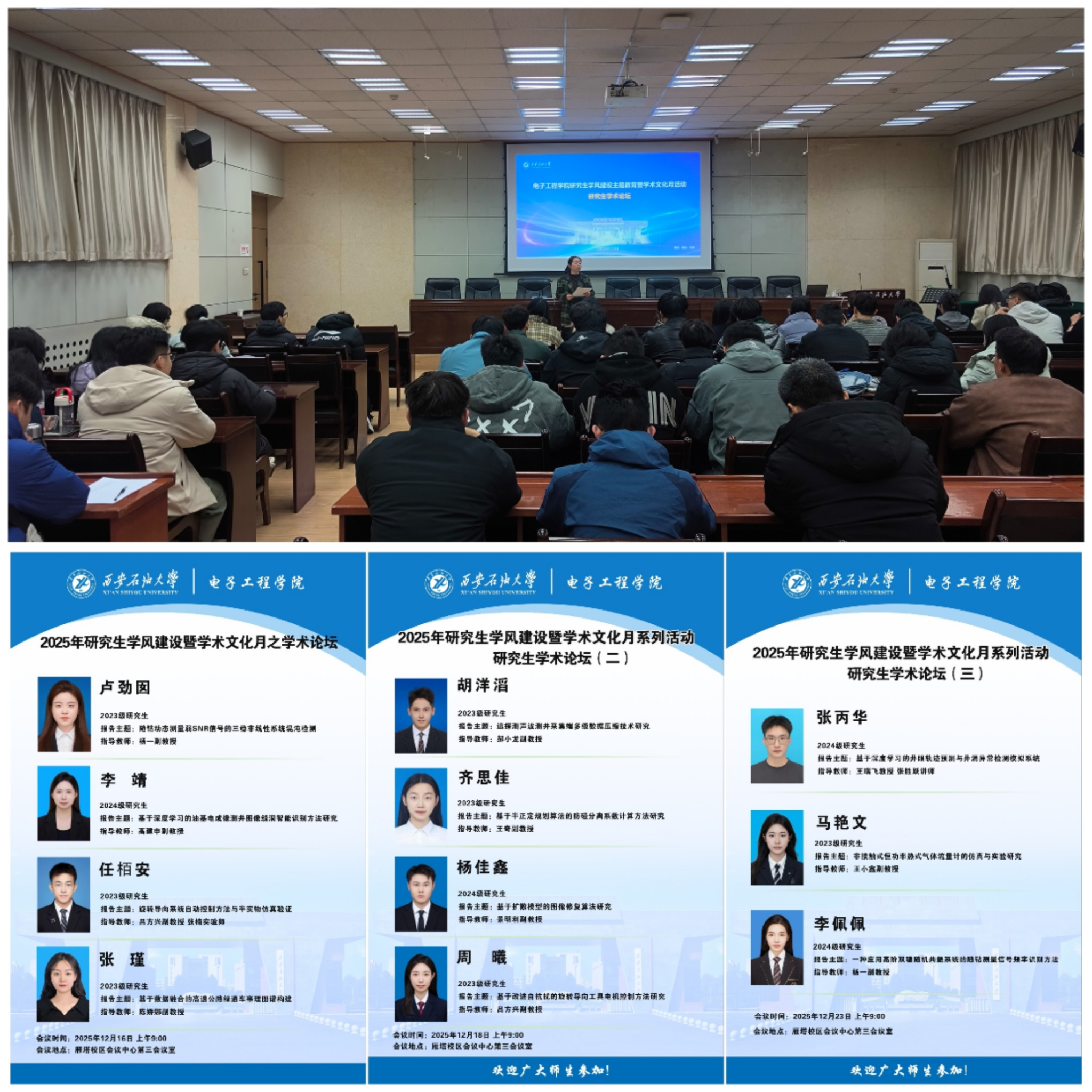 按照學校研究生工作部關于2025年研究生學風建設暨學術文化活動月的安排部署,電子工程學院緊扣“守學術誠信之本 筑創(chuàng)新發(fā)展之基”核心主題,立足學科特色與研究生培養(yǎng)需求,于2025年11月-12月扎實開展研究生學風建設主題教育暨學術文化月系列活動,將政治引領、學術交流、升學就業(yè)等內容深度融合,形成了“黨建引領、學術賦能、育管并重”的學風建設新格局。