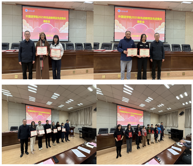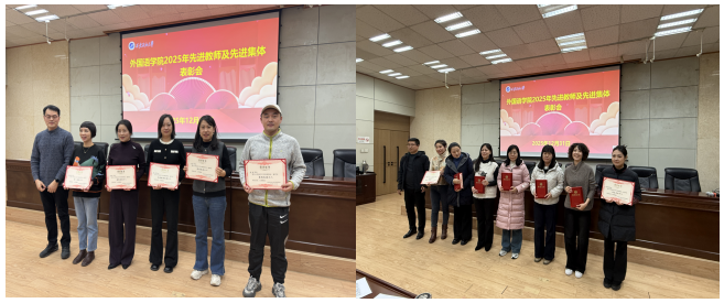 在述職述廉會議之后,學(xué)院召開2025年先進(jìn)教師和先進(jìn)集體的表彰大會,陳武宣讀了《外國語學(xué)院關(guān)于公布2025年度先進(jìn)教師及先進(jìn)集體評選結(jié)果的通知》,對在教育教學(xué)、科學(xué)研究、人才培養(yǎng)、管理服務(wù)等工作中表現(xiàn)突出的4個先進(jìn)集體和29名先進(jìn)教師予以隆重表彰。學(xué)院黨政領(lǐng)導(dǎo)和工會主席為獲獎集體與個人頒發(fā)榮譽證書,陳武向受表彰的先進(jìn)集體和先進(jìn)教師表示熱烈祝賀,他們身上愛崗敬業(yè)、甘于奉獻(xiàn)的精神,值得全體教師學(xué)習(xí)借鑒,全體教師要以先進(jìn)為標(biāo)桿、以榜樣為力量、主動對標(biāo)看齊,為學(xué)院發(fā)展貢獻(xiàn)自己的力量。