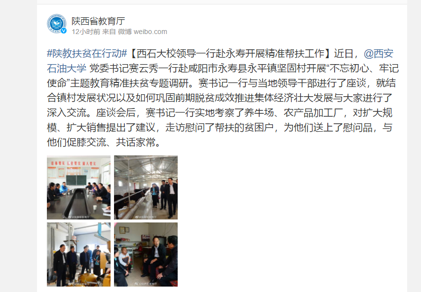 近日,西安石油大學黨委書記賽云秀一行赴咸陽市永壽縣永平鎮(zhèn)堅固村開展“不忘初心、牢記使命”主題教育精準扶貧專題調研。賽書記一行與當?shù)仡I導干部進行了座談,就結合鎮(zhèn)村發(fā)展狀況以及如何鞏固前期脫貧成效推進集體經濟壯大發(fā)展與大家進行了深入交流。座談會后,賽書記一行實地考察了養(yǎng)牛場、農產品加工廠,對擴大規(guī)模、擴大銷售提出了建議,走訪慰問了幫扶的貧困戶,為他們送上了慰問品,與他們促膝交流、共話家常。