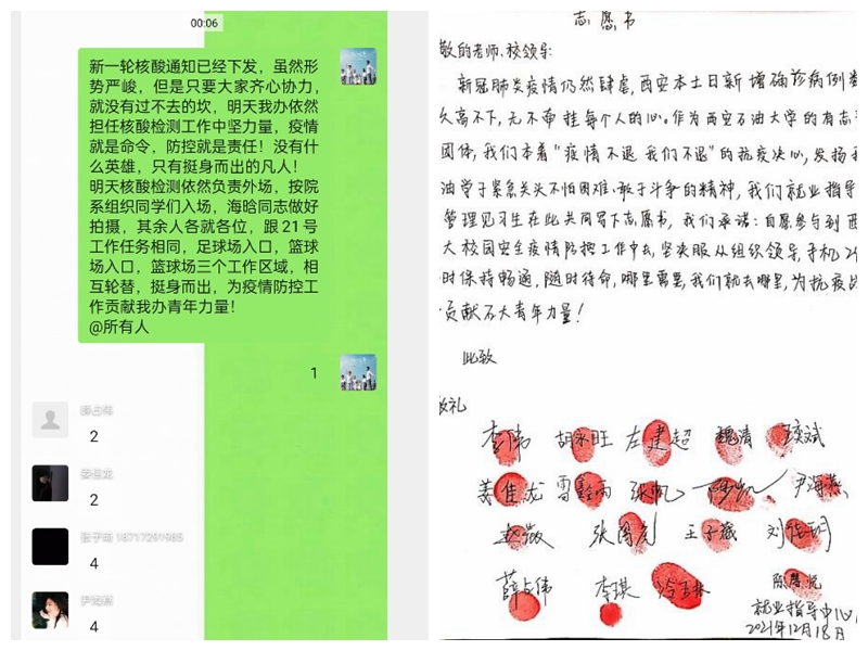 大“疫”面前,人人有責(zé),人人盡責(zé)。在眾多的學(xué)生志愿者中,由學(xué)生工作部(處)就業(yè)指導(dǎo)中心組織的18名大學(xué)生管理見習(xí)生志愿者分外搶眼。無論是在凌晨、還是深夜,他們24小時(shí)待命,隨時(shí)集結(jié)。在鄠邑校區(qū)全員核酸檢測的現(xiàn)場,每次都有他們忙碌的身影,往往是連續(xù)奮戰(zhàn)10幾個(gè)小時(shí)。他們秉持“團(tuán)結(jié)、務(wù)實(shí)、認(rèn)真、高效”理念,敢于沖鋒、敢于斗爭、敢于勝利,鍛造出堅(jiān)如磐石、舍生忘己、心懷眾“生”的可貴品質(zhì)。