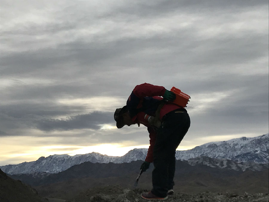 2014年是他工作的第一年,7、8月份的新疆哈密戈壁灘上正是烈日炙烤大地正旺的時(shí)候,熱浪滾滾,沙子都可以把雞蛋燙熟。他和隊(duì)友頭頂著炎炎烈日,踏著灼熱砂礫,扛著重力儀攀爬一個(gè)又一個(gè)沙丘。日出而作,在無(wú)垠的戈壁中一次一次按下儀器按鍵,餓了啃口饅頭,渴了喝口白開(kāi)水。完成一天的野外工作任務(wù),輾轉(zhuǎn)回到項(xiàng)目駐地,已是晚上8點(diǎn),日頭還是那么毒,汗水已經(jīng)把衣服浸透了,第一次出野外的他開(kāi)始想念家人。