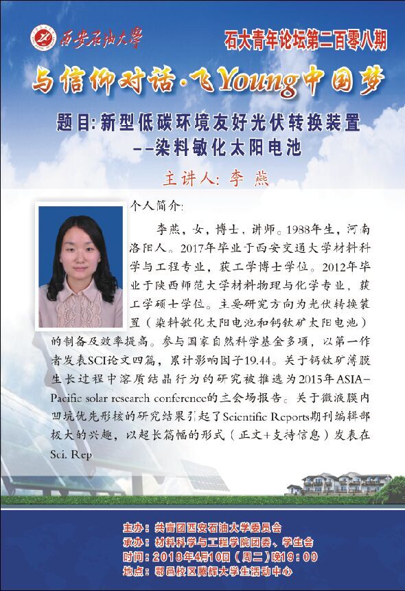石大青年論壇第208期之:新型低碳環(huán)境友好光伏轉(zhuǎn)換裝置——染料敏化太陽電池